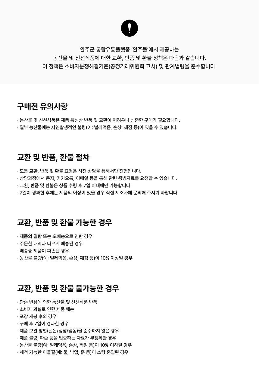 - 농산물 및 신선식품은 제품 특성상 반품 및 교환이 어려우니 신중한 구매가 필요합니다.